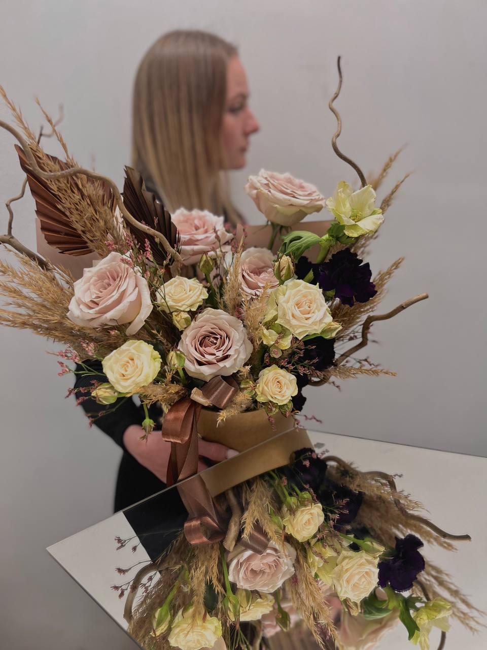 из кустовых, одноголовых роз и диантуса